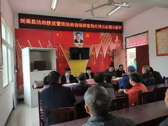 为深入开展“法律七进”,全面落实信访法治化建设,切实提高群众法治观念和理性维权意识,推动法治扶贫,共建平安法治剑阁,2019年11月5日下午,剑阁县司法局、剑阁县元山镇人民政府、四川剑州律师事务所联合在剑阁县元山镇石板村开展法治扶贫暨依法治访法治宣传活动。元山镇镇综治办、派出所、林业站、劳保所、税务所、扶贫帮扶单位等相关人员及七一村村民代表50余人参加活动。
