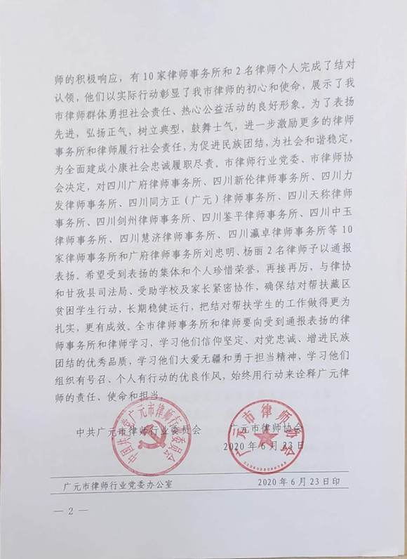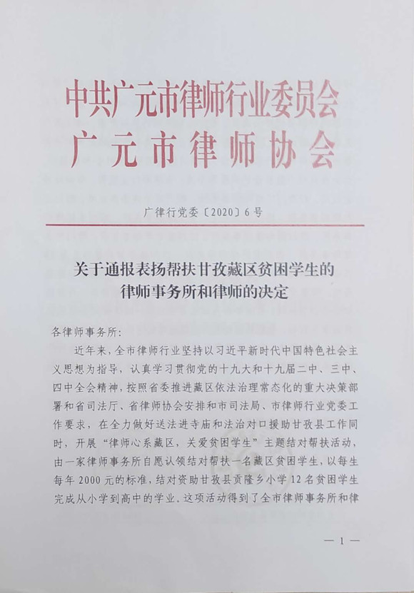 我所帮扶甘孜藏区贫困学生被中共广元市律师行业委员会、广元市律师协会决定通报表扬